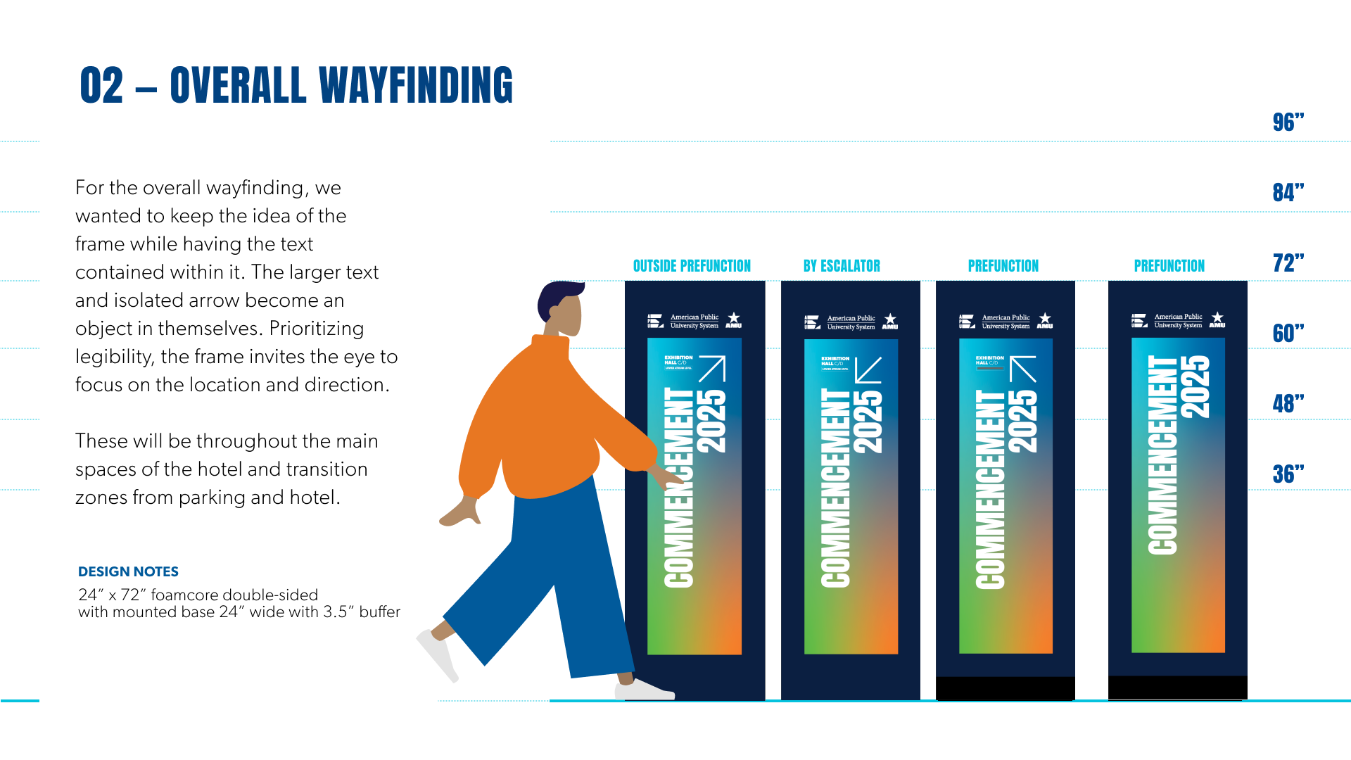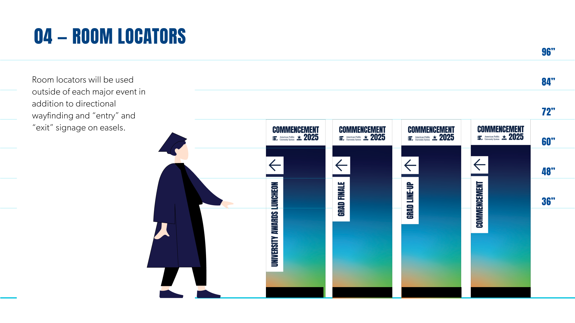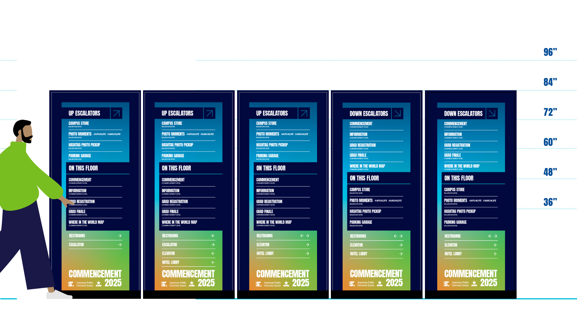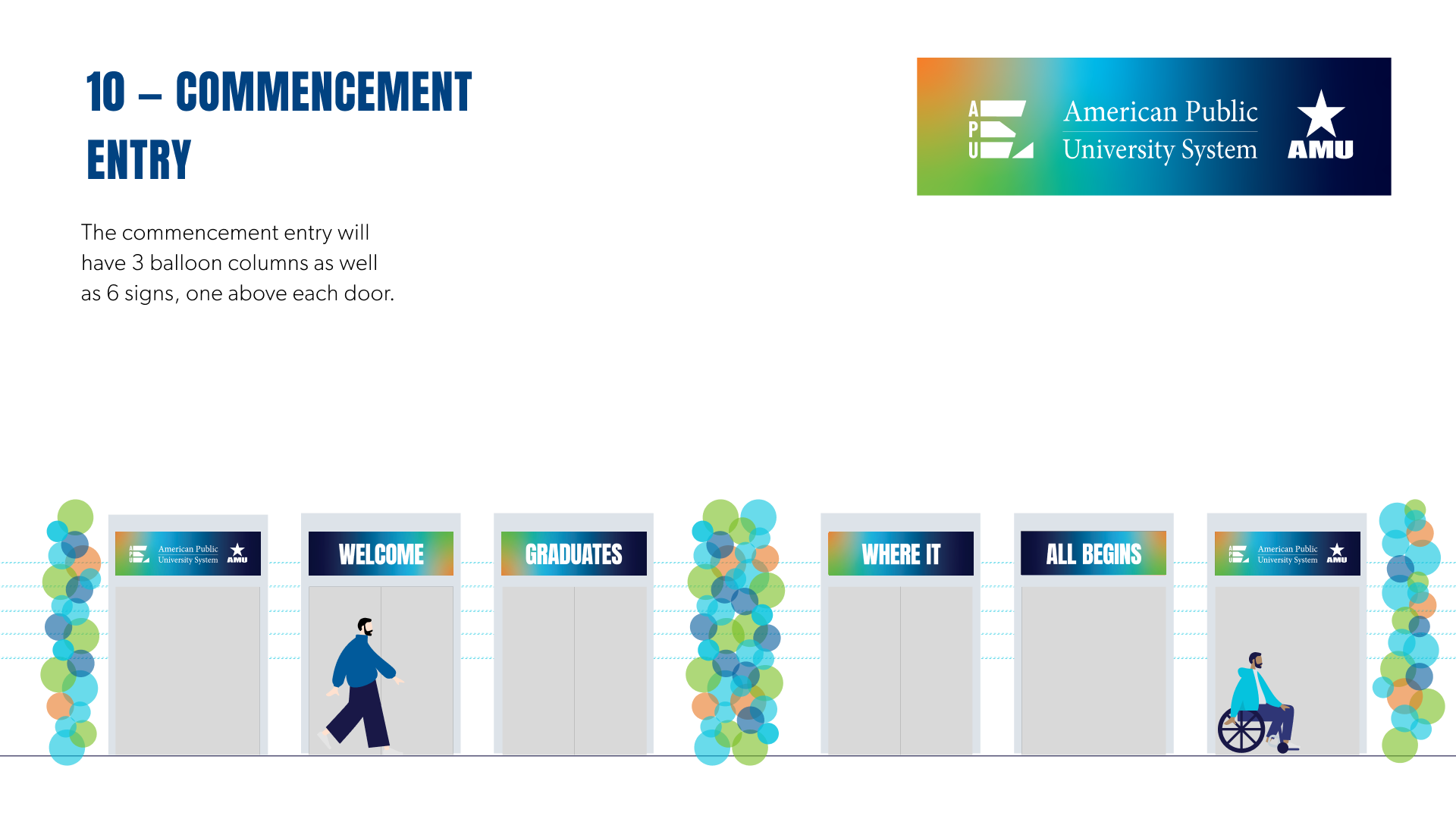 The American Public University System sought a full team to support their Commencement for 2025. The Happily Team brought together a team of producers, designers, creative directors, a/v, set designers, and more to bring this vision to life. Our team supported the creative direction team and worked directly with the set designers to ensure every detail was buttoned up. We also worked to develop a cohesive wayfinding system that can be replicated in future years to create cohesion.